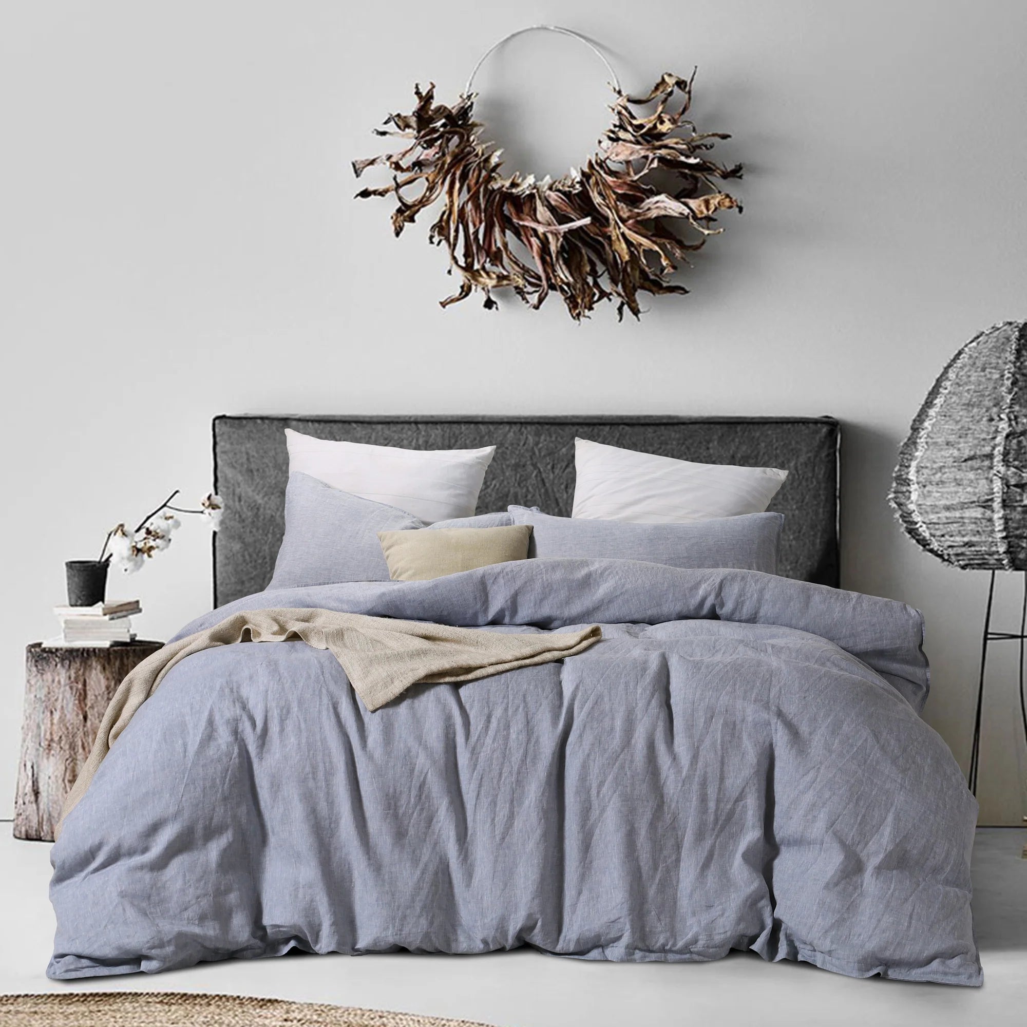 Our French linen duvet cover set adds color and elegance to your room with a perfectly dyed shade. Made from prewashed linen sourced from France, it’s extra soft and offers a natural "lived-in" look, with no ironing needed. The duvet cover features a hidden button placket for a clean finish, while the pillowcases have a housewife tuck to keep pillows in place. The double-stitched edge gives a polished, tailored look.