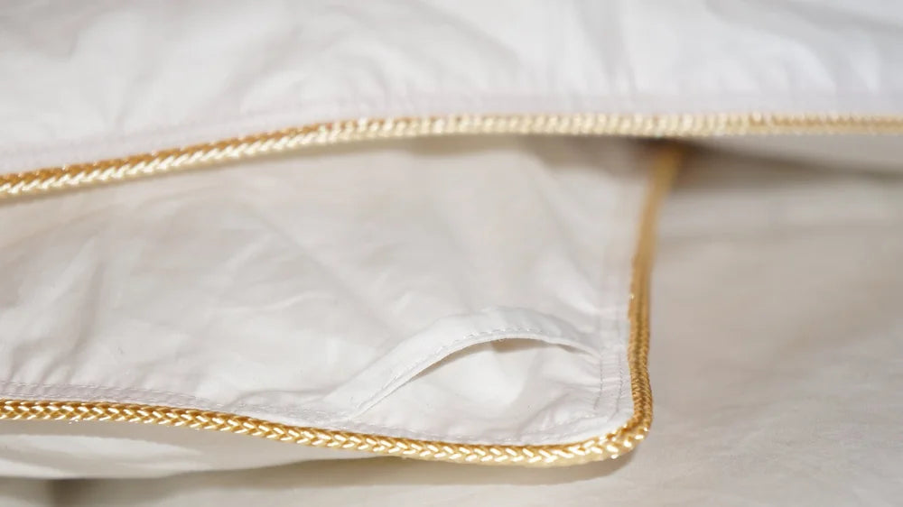 • Shell: 500 Thread count, 100% combed cotton, down proof, Super Soft Treatment, double needle edge with Germany Silk-Like Gold piping, white color.